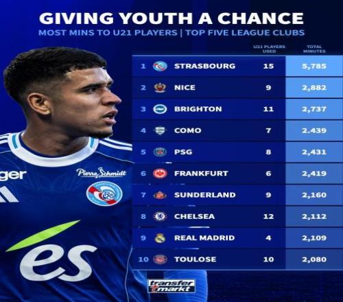 北京时间10月16日,德转统计出了本赛季至今欧洲五大联赛俱乐部U21球员的出场时间排行榜,斯特拉斯堡15名球员共计出场5785分钟高居第一,巴黎圣日耳曼、切尔西以及皇家马德里也都进入前10位。