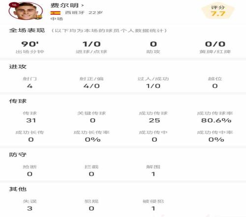 统计显示,费尔明本场比赛踢了90分钟,4次射门均射正,打入1球。