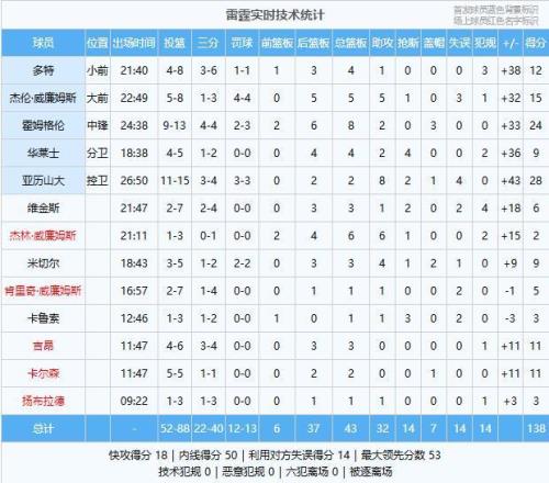 雷霆(主队):亚历山大28分2板8助2断、霍姆格伦24分8板2助3帽、杰伦·威廉姆斯15分5板5助、多特12分4板1助、吉昂11分3板、卡尔森11分2板、华莱士9分4板2助4断、米切尔9分3板4助2帽、维金斯6分3板1助2断、肯里奇·威廉姆斯5分1板1助、卡鲁索3分1板1助3断