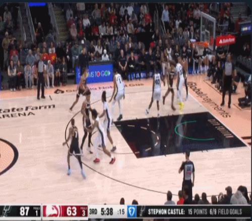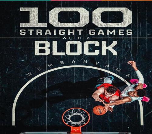在比赛进行到第三节中段时,文班亚马血帽戴森-丹尼尔斯的上篮,他一把将对方的投篮扇到了计时器上,这也让文班连续100场比赛有盖帽入账,他也成为达成该成就的历史第三人。在他之前的两位球员是帕特里克-尤因(145场)和迪肯贝-穆托姆博(116场)。