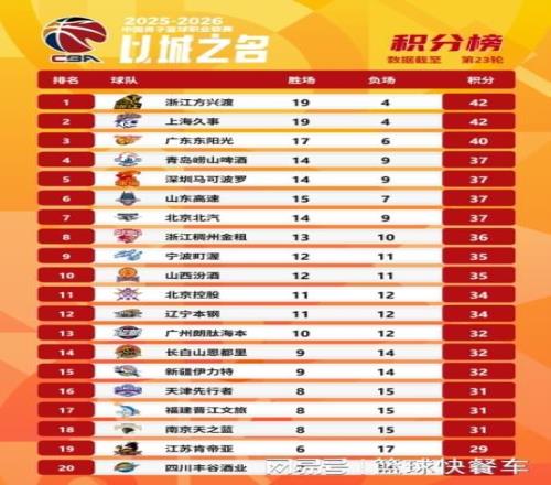 随着,CBA第23轮全部结束,本赛季第一阶段的比赛也正式结束。目前,CBA积分榜榜首之争,已经从三家鼎立,变成双雄争霸格局。目前,积分榜榜首位置还是属于卫冕冠军广厦,他们的战绩为19胜4负。不过,在这一轮比赛,上海队客场掀翻广东队以后,他们的战绩也提升到19胜4负,战绩上已经追上了广厦队,只不过在小分上的劣势,上海队只能暂居积分榜第2名。