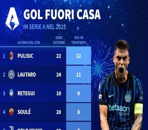意甲球员2025年客场进球榜:普利希奇12球第1,劳塔罗11球第2 -